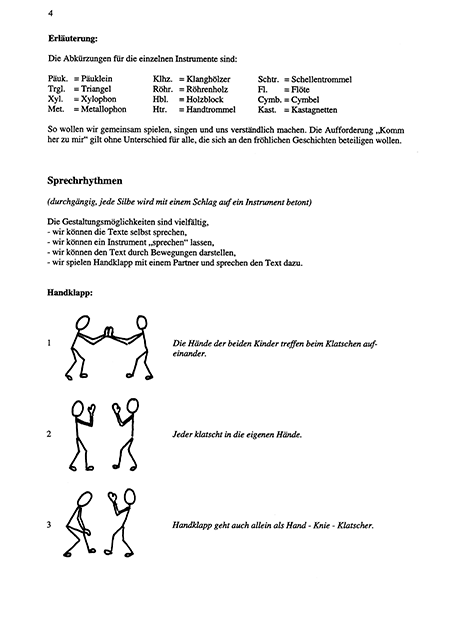 Besonders für behinderte Kinder eignet sich das sprechrhythmische Spiel, welches an eine lustige Handlung gebunden ist und ihren Ausdruck im Spiel mit den verschiedenen Instrumenten hat. Die sprechrhythmischen Spiele, wie sie im folgenden Teil dieser Aufzeichnung vorgestellt werden, sind in der praktischen Arbeit erprobt worden.